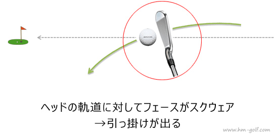 この時、フェースがヘッドの軌道に対してスクウェアであれば、引っ掛け(=左に真っすぐ飛んで行くショット)が出やすくなります。
