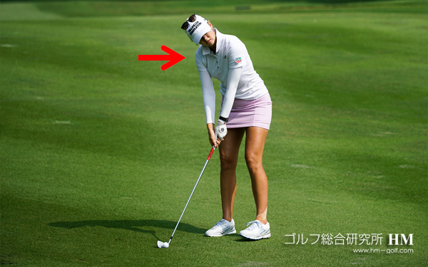 もし、この癖がある方の場合は右肩を後ろに引くような意識で構えていただくのもいいですし、また、目標を確認する際にも右肩を意識していただくといいと思います。