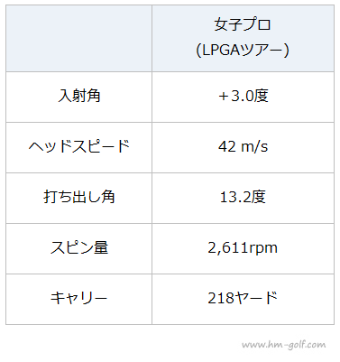 また、参考までに入射角のデータ以外にも、打ち出し角やヘッドスピード、飛距離やスピン量なども掲載しておきます。(いずれも、LPGAツアーの平均値。2017年計測)