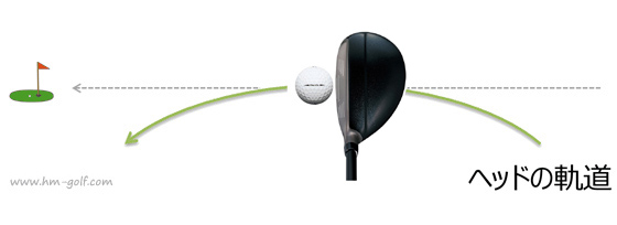 この場合は、ヘッドの軌道をアウトサイド・インから、下の図のようにインサイド・インにしてあげると、ヘッドがボールの横から入ってきやすくなります。