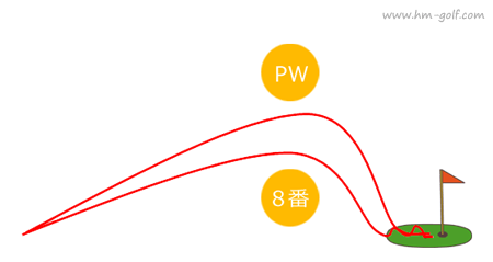 ヘッドスピードを上げて打つとバックスピンが増えてボールも高く上がりますから、番手によってはピンの真上からボールを落とすような意識でもいいかも知れません。