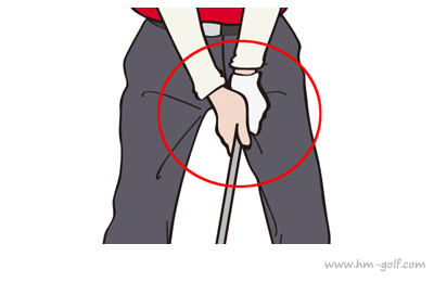 構えた際にグリップがズボンのジッパーの前に来ている方がよくいらっしゃいますが、このように構えると、ダウンブローでは打てません。